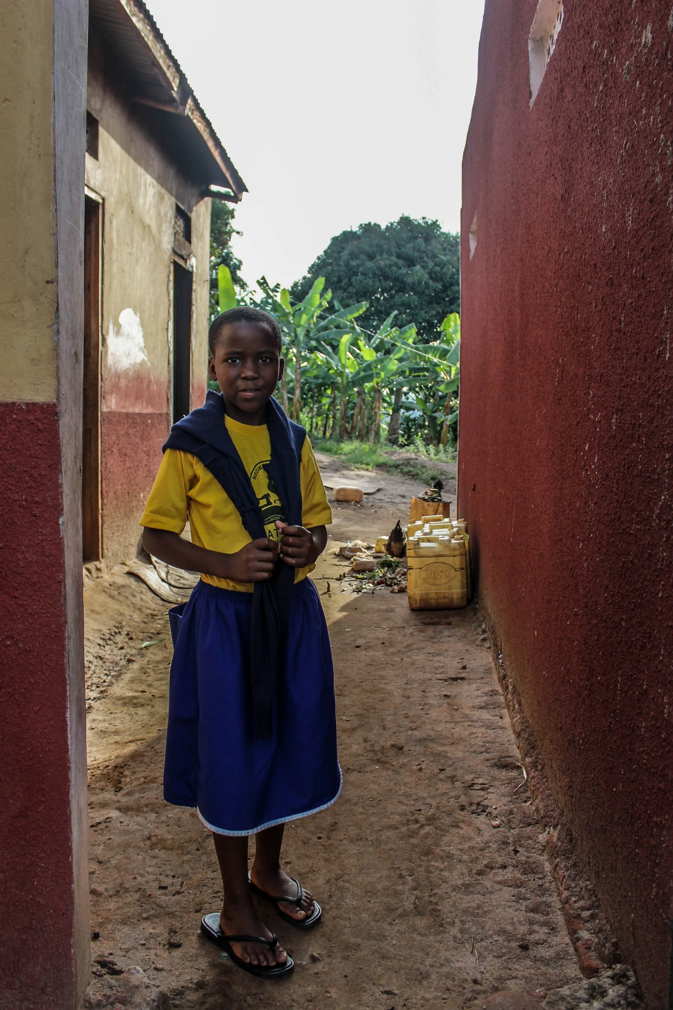 Goretti's home is a simple structure surrounded by her uncle's crops. The yellow containers behind are a constant sight in rural Uganda as they're used to carry water from a well. This can be a long journey for many children to carry many litres of water on their backs each day.