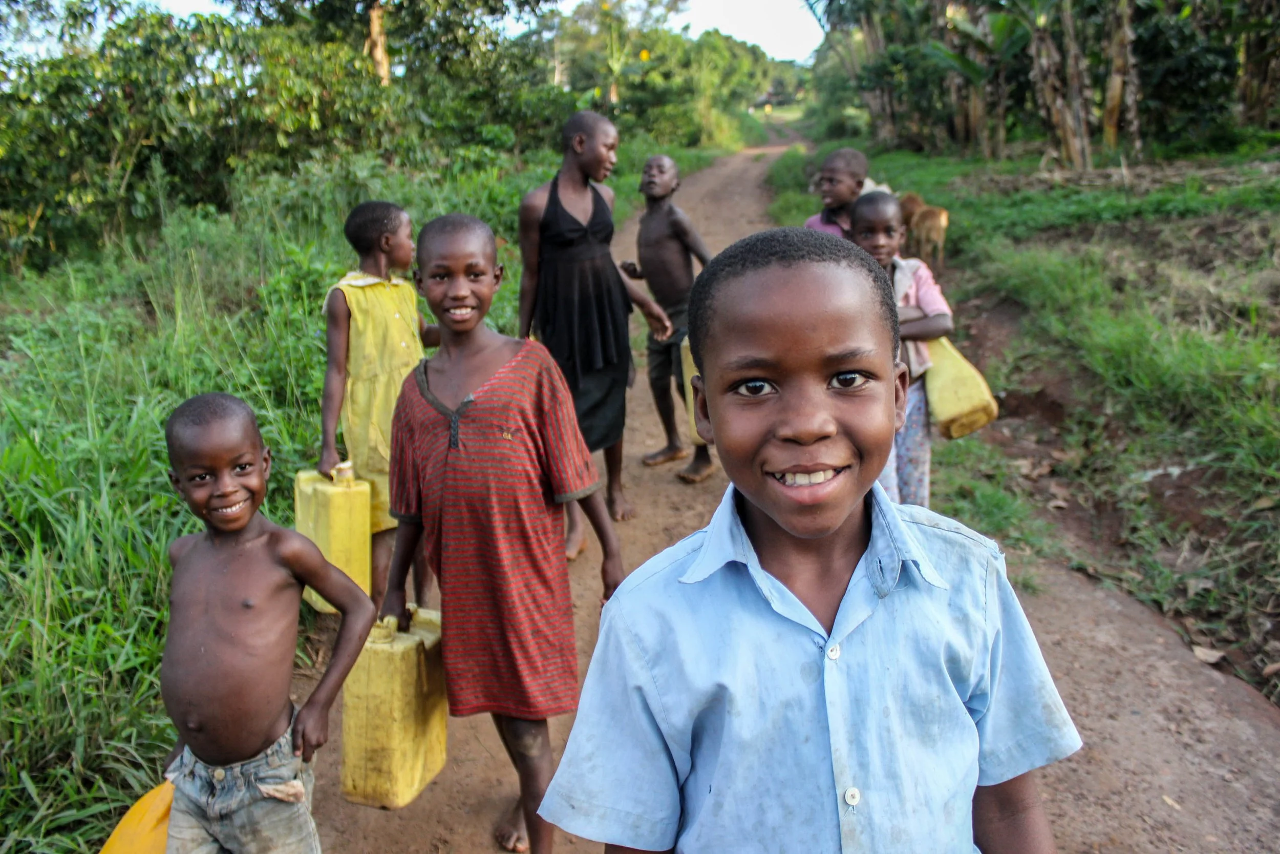 Goretti and her neighbours smile for the camera as they go out to collect water from their local well. The children - boys and girls - keep their hair cut short to stop worms, ticks and lice.