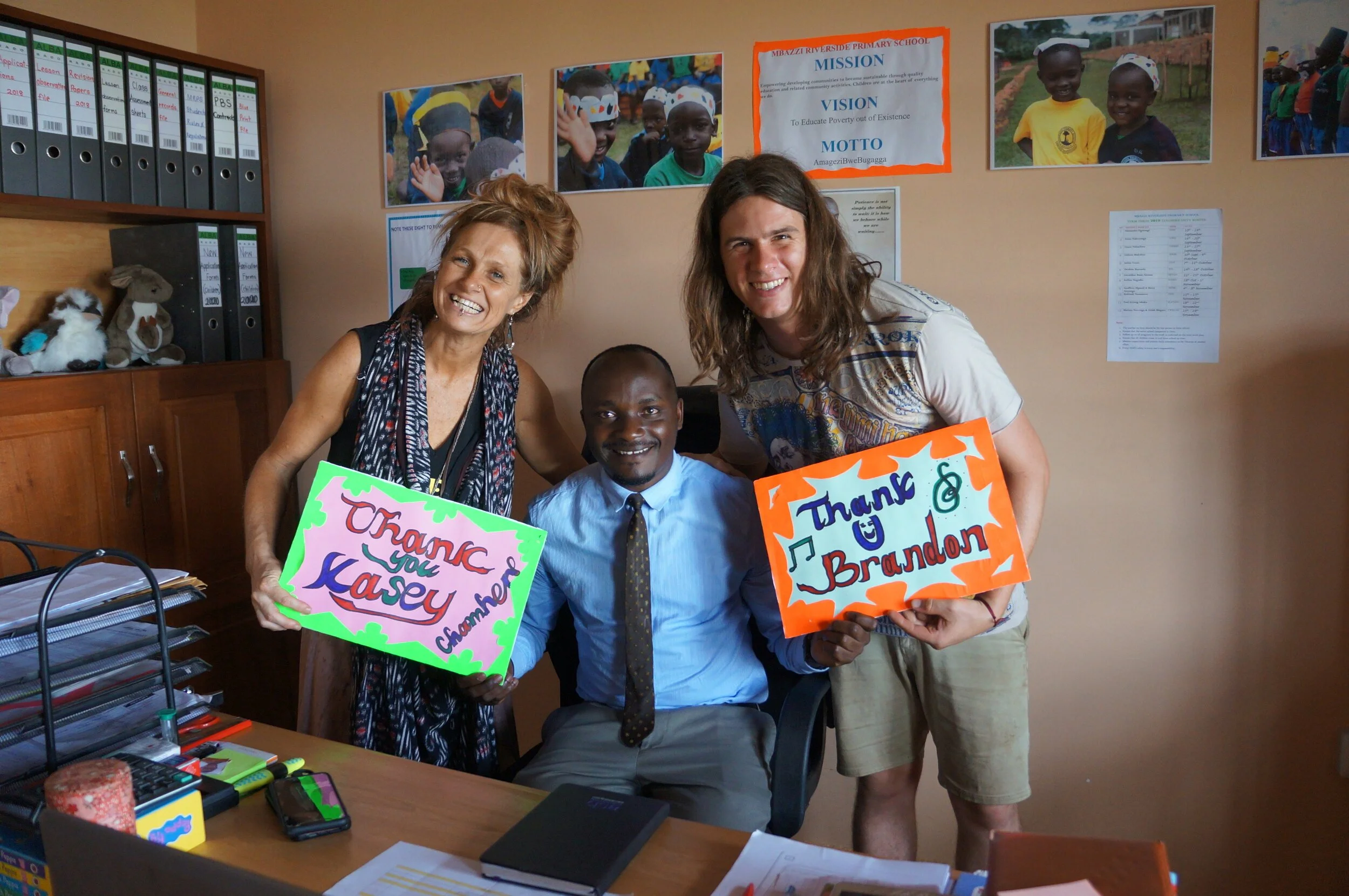 Kasey and Brandon with Head Teacher at Mbazzi Primary, Joseph