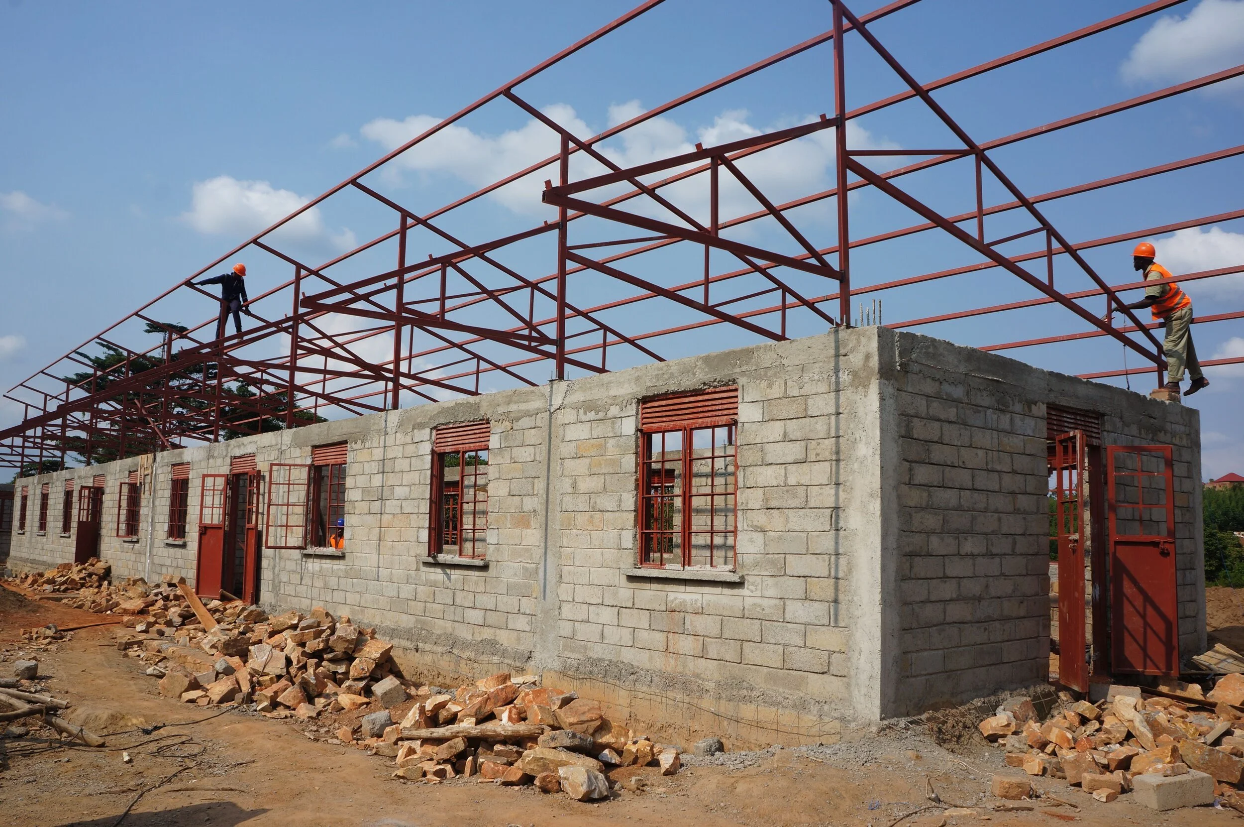 The start of August brought even more action, with our construction team being joined by our roofing team on site to start welding up and installing the metal frames to create the roof of the boarding school.