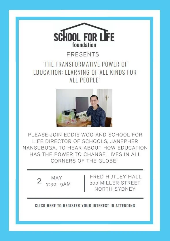 The Transformative Power of Education: Learning of all kinds for all People Thursday, May 2, 2019 7:30 AM 9:00 AM Google Calendar ICS Please join Eddie Woo and School for Life Director of Schools, Janepher Nansubuga, on the 2nd May to hear about how education has the power to change lives in all corners of the globe. REGISTER HERE